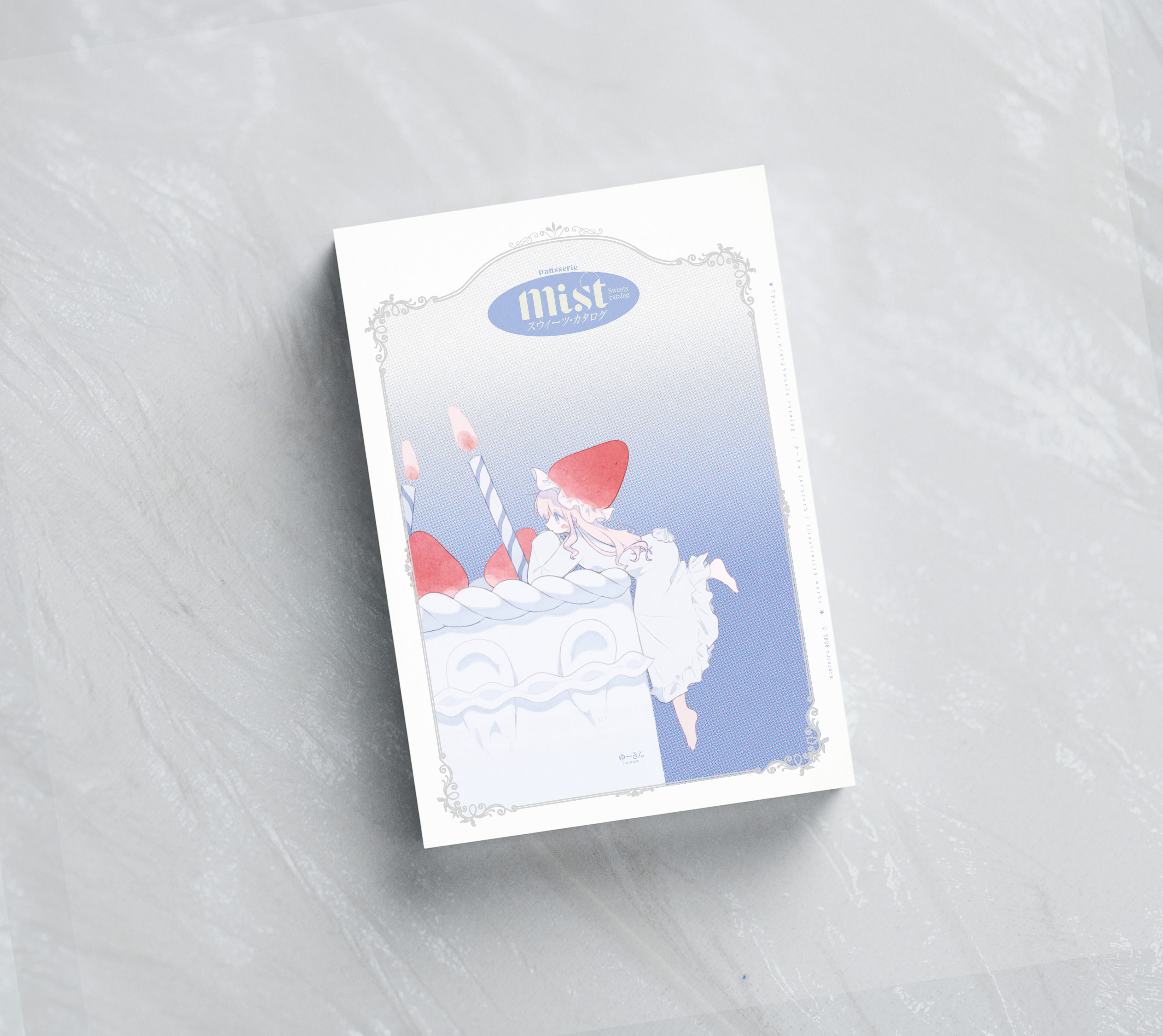 制作の道中も、アイデアを出し合いながら細部を何度も往復し、最終的に「創作物としてのカタログ」へ着地できたと思います。手に取ったとき、霧の向こうからスイーツ店がふっと現れて、読み終わるとまた消えていくような一冊を目指しました。